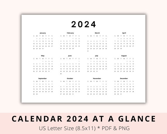 Calendar 2024 at A Glance, Yearly One Page, Calendar Printable